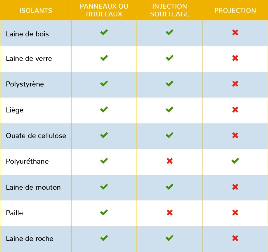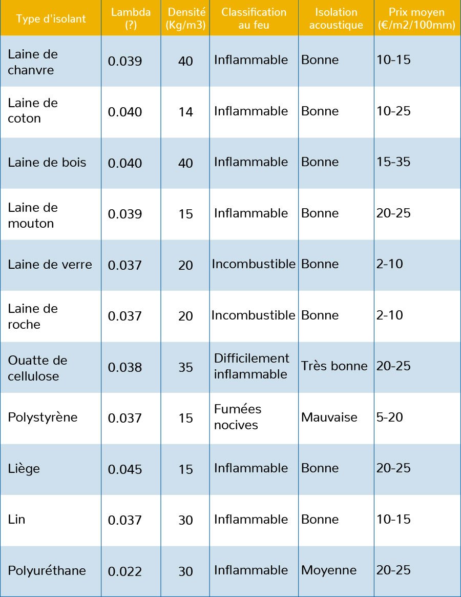 Le tableau de comparaison que nous vous proposons vous liste les critères d’identification des bons isolants. Il répertorie donc les performances des isolants les plus répandus et utilisés en France.